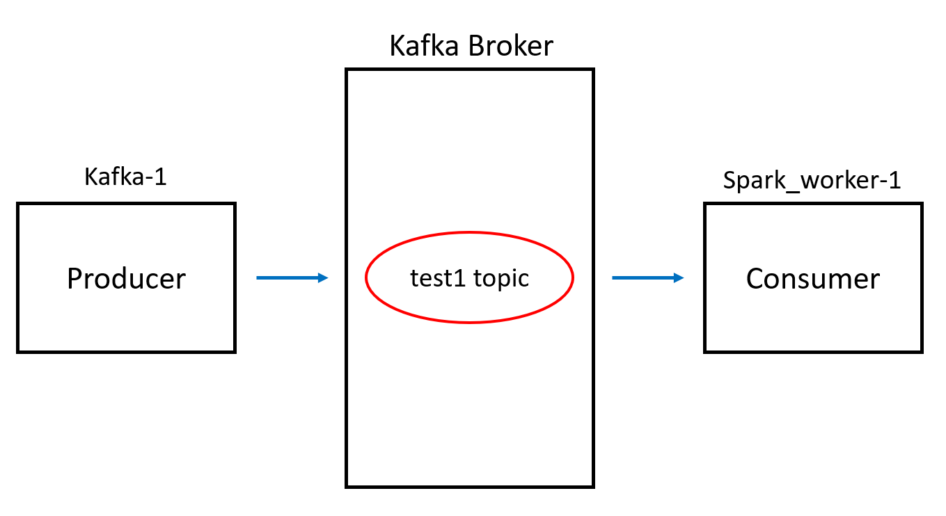 이전 글에서는 console 창에서 입력하는 값을 topic에 produce 했었습니다. 이번에는 csv 파일을 이용하여 실시간으로 데이터를 전송하는 것처럼 producer를 구현하도록 하겠습니다. 글에서 실습할 전체적인 과정은 아래 이미지와 같습니다. Kafka-1 container가 Producer의 역할로 test1이라는 Kafka topic에 데이터를 보내고 test1 topic에 담겨있는 내용을 Spark_worker-1 container가 Consumer의 역할로 Spark structured streaming을 이용해 데이터를 가져와서 처리를 해줍니다. 참고로 Kafka-1 container는 Kafka Broker에 속한 container입니다.