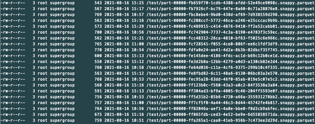 마지막으로 HDFS에 접근하여 stream 데이터가 parquet 포맷으로 저장이 잘되는지 확인합니다. 이 때는 hdfs 명령어를 이용해줍니다. 아래의 이미지처럼 해당 HDFS 경로에 parquet 포맷의 파일들이 존재한다면 정상적으로 저장된 것입니다.