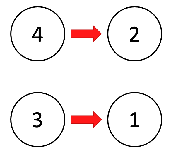 테스트 케이스 2번을 예시로 든다면 아래 그림처럼 4가 2를 가리키고 3이 1을 기리 키는 구조가 됩니다. 이 두 관계를 제외하고는 각 숫자들은 서로 연관되지 않습니다.