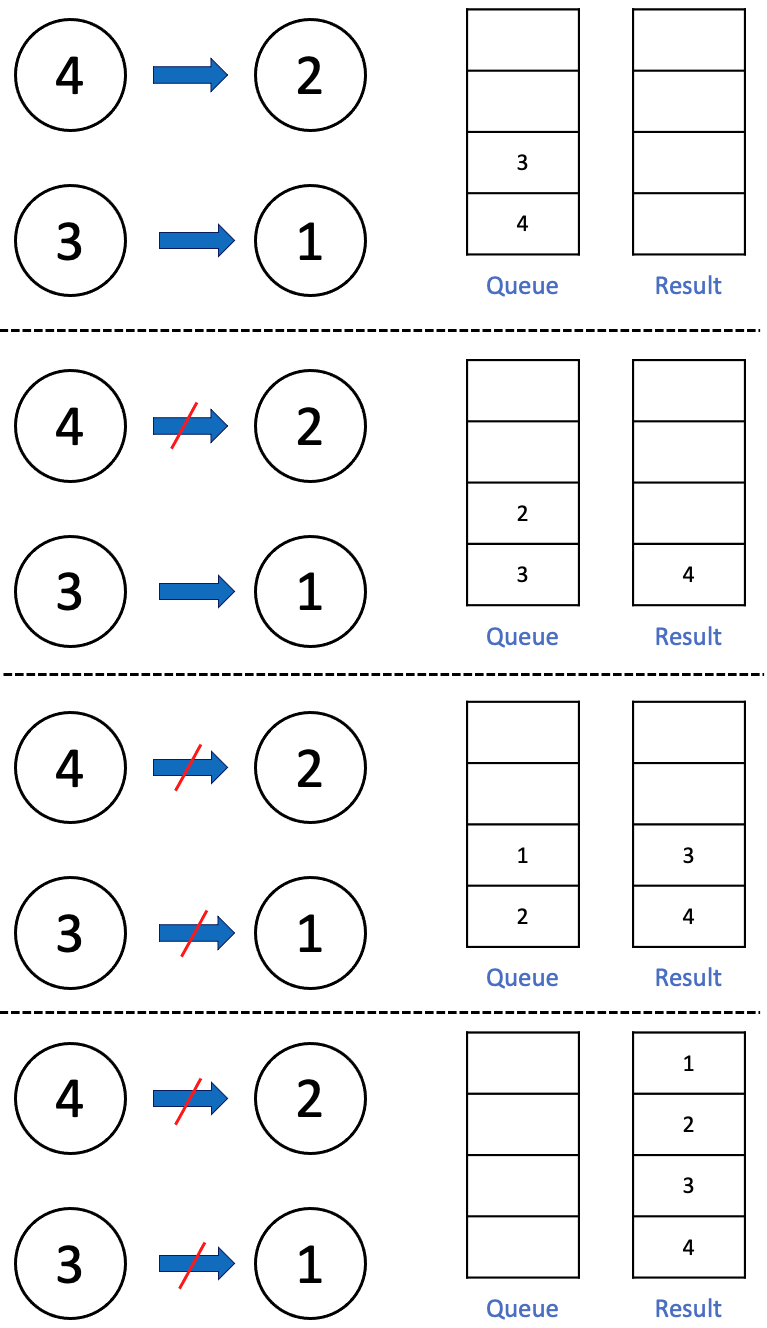 위상 정렬의 핵심은 "간선이 없는 노드를 처리하자" 입니다. 여기서 간선이 없는 노드의 뜻은 "가리킴을 당하지 않는 노드"입니다. 그래서 저의 풀이는 Queue를 사용했고 처리하는 과정에서 간선이 없는 노드가 생겨난다면 다시 Queue에 넣는 작업을 진행합니다. 이때 Queue에서 나오는 순서가 이 문제의 답입니다. 위의 예제에서는 현재 4와 3이 간선이 없는 노드입니다( 가리킴을 당하지 않는 노드 ). 그래서 Queue에 4와 3이 가장 먼저 들어갑니다. Queue에서 4가 나오면서 가리키고 있던 노드를 순회하고, 대상 노드의 간선 수를 -1 시킵니다. 즉 4가 가리키고 있던 2 노드의 간선 수는 기존 1에서 0이 되어 Queue에 추가됩니다. 이렇게 Queue가 비워질 때까지 반복하면서 최종 결과를 출력합니다.