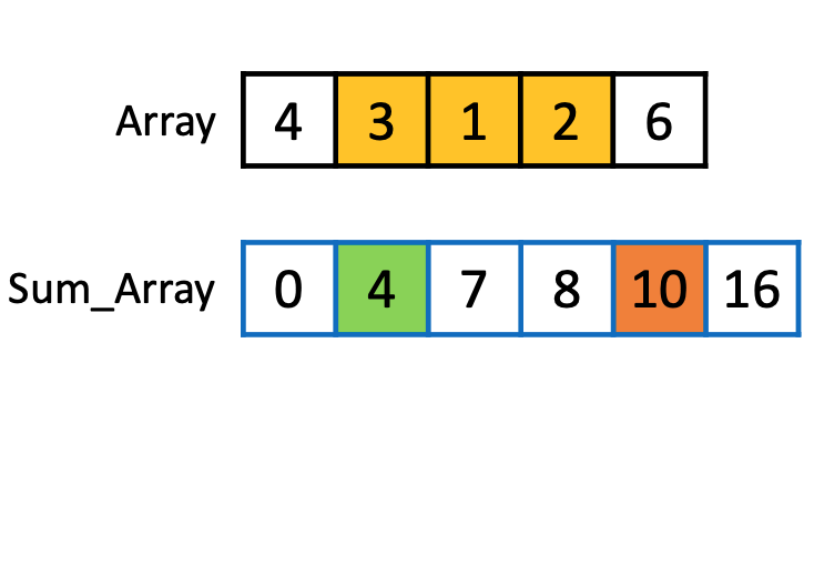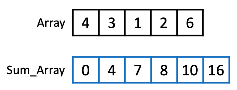 좀 더 부연 설명을 하자면 Sum_Array의 \( i \)번째 값은 0부터 \( i-1 \) 까지 원소들의 합이므로 Sum_Array[2] 는 Array[0] + Array[1]의 값을 가집니다. 하지만 실제로 값을 저장할 때는 처음부터 저장하면 \( O(n) \)의 시간이 걸리므로 Sum_Array[\( i+1 \)] = Sum_Array[\( i \)] + Array[\( i \)]으로 구할 수 있습니다. 이러면 반복문이 필요 없는 단순 덧셈이므로 \( O(1) \)의 시간이 걸립니다.