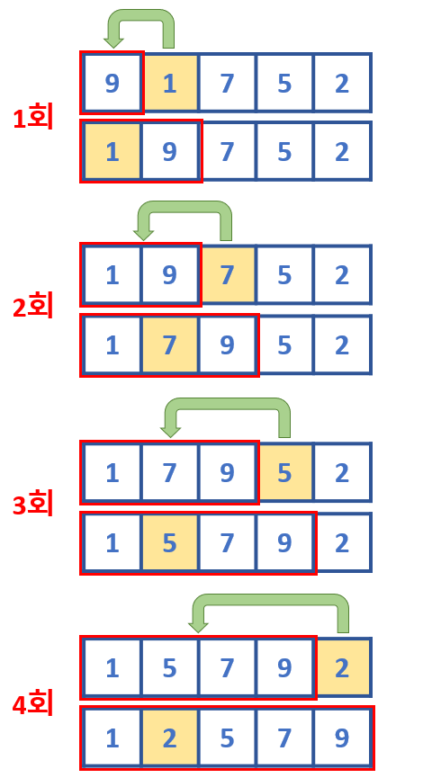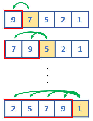 { 9, 1, 7, 5, 2} 순서대로 원소가 존재한다고 가정했을 때 삽입 정렬의 예시는 다음과 같습니다.