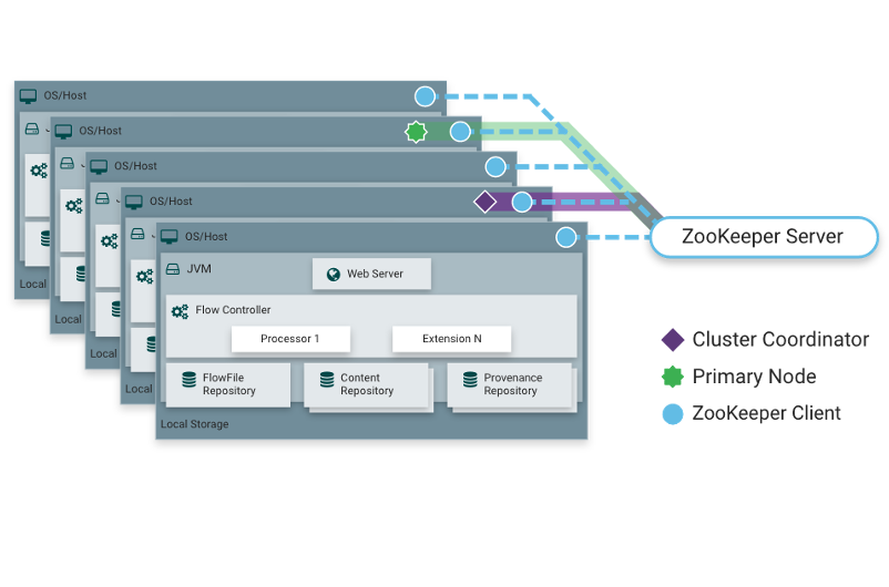 NiFi도 클러스터 환경으로 운영할 수 있습니다. 그러나 일반적인 Hadoop의 Master - Slave 구조처럼 다른 노드들을 관리만 하는 NameNode가 존재하지 않습니다. NiFi의 각 노드들은 동일한 역할을 수행하며 단지 특정 노드 몇개만 추가적인 역할을 담당하고 있습니다. 이 때 추가적인 역할은 Primary Node와 Cluster Coordinator이고 ZooKeeper가 특정 노드에게 역할을 부여합니다.