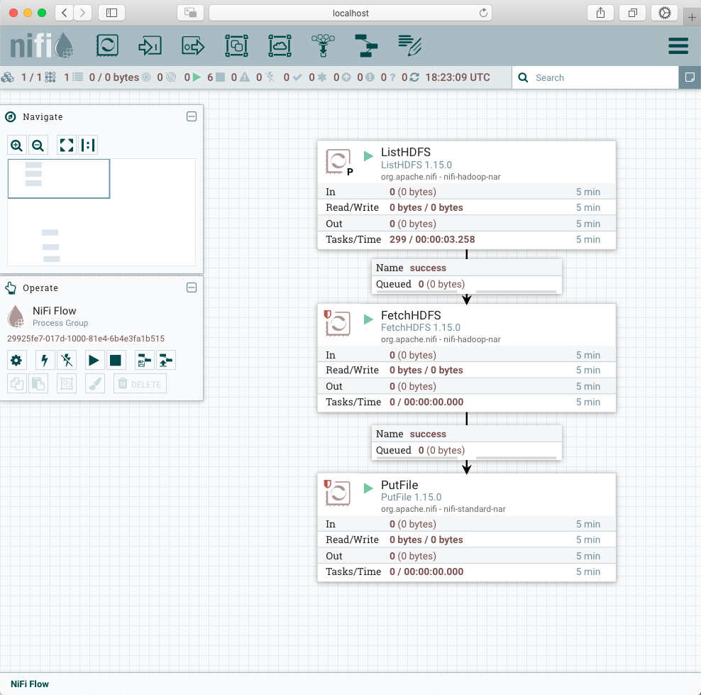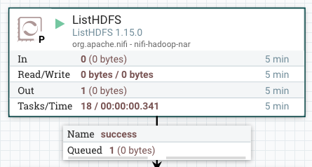 설정 값을 모두 넣어줬으니 좌측에서 ListHDFS부터 실행해줍니다. 각 Processor가 수행되면 이어진 Queue에 적재되는 것을 확인할 수 있습니다.