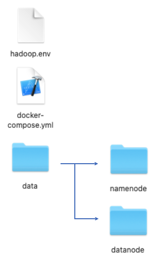 yml 파일을 모두 작성했다면 Hadoop 서비스에 필요한 volume mount를 위해 현재 폴더에 "data/namenode", "data/datanode" 폴더를 만듭니다. yml 파일에서 namenode와 datanode 서비스를 보면 이 폴더들을 대상으로 mount를 진행하기 때문입니다.