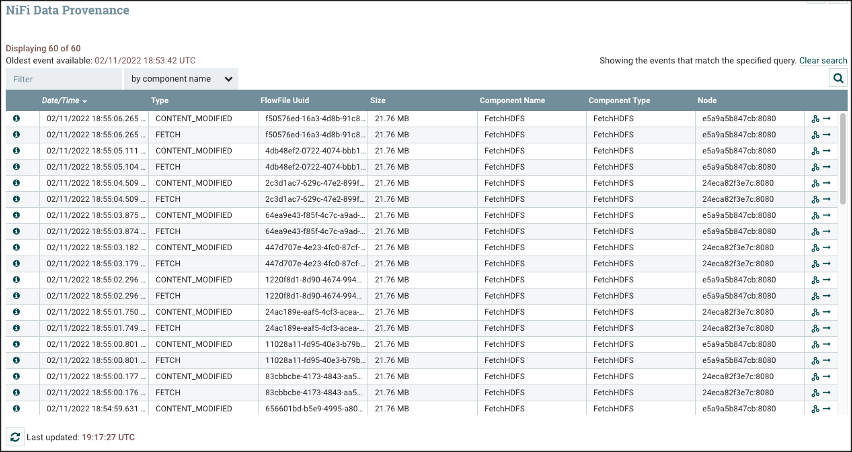 위의 그림처럼 30개 파일이 각각 3개 노드에 분산 처리된 것을 결과로써 확인할 수 있습니다. 그리고 이러한 분선 처리 과정은 NiFi UI에서도 확인 가능합니다. FetchHDFS에 마우스 우클릭을 하여 "View data provenance"를 확인해줍니다.