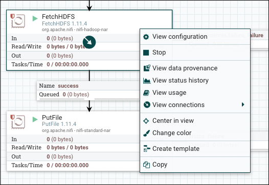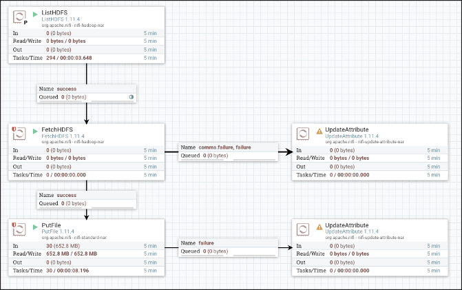 Process Group 내부로 들어왔다면 이전 글을 참고하여 ListHDFS, FetchHDFS, PutFile Processor를 만들어줍니다. FetchHDFS와 PutFile Processor 우측에는 Processor 작업이 실패되었을 때 FlowFile을 임시로 보관하기 위한 임시 Processor를 만들어줍니다. 주의할 점은 좌측과 우측 Processor를 연결하는 Queue의 조건은 comms.failure와 failure로 설정해줍니다.