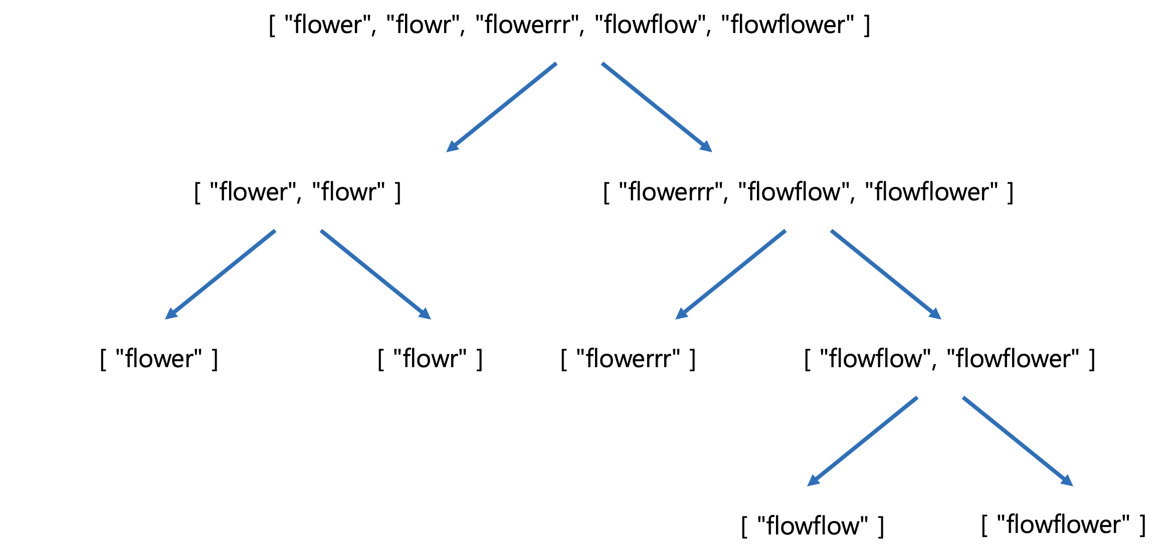 String 리스트가 주어질 때 리스트 길이가 1이 될 때까지 index를 계속 두 그룹으로 나눠줍니다. 재귀 함수를 사용하여 쉽게 구현할 수 있습니다. 해당 재귀 함수는 String끼리 비교하며 LCP를 구하며 가장 처음의 함수까지 올라옵니다. 아래 그림을 보면 더 쉽게 이해할 수 있습니다.