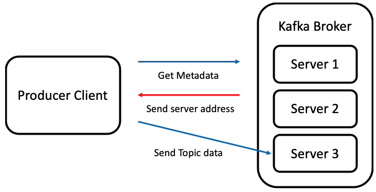 Producer Client는 처음부터 Topic data를 보내는 것이 아니라 topic이 저장된 위치를 알기 위해 Metadata를 Kafka Broker 중 하나에게 요청합니다. 요청을 받은 Broker는 Client가 원하는 topic이 위치한 서버 리스트를 보내줍니다. 그리고 최종적으로 Client는 Broker로부터 받은 서버 리스트를 참고해서, 서버에 직접 접근 및 데이터 전송을 합니다.