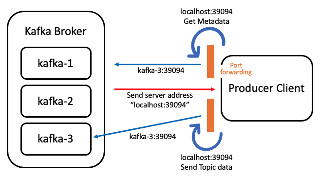 하지만 위 그림과 설정에서 이상한 점을 느낄 수 있습니다. Host machine은 Kafka broker의 hostname을 모르기 때문에 localhost로 반환해주는 것인데, 외부 통신을 의도한 BB listener는 "kafka-3"이라는 hostname을 직접 명시했을까요? 위의 그림과 설정에서는 Host machine과 Docker container 간의 port forwarding 과정이 빠져있기 때문입니다. Kafka 클러스터와 Host machine의 Producer Client만 다시 분리해서 port forwarding 과정을 추가하면 아래 그림과 같습니다.
