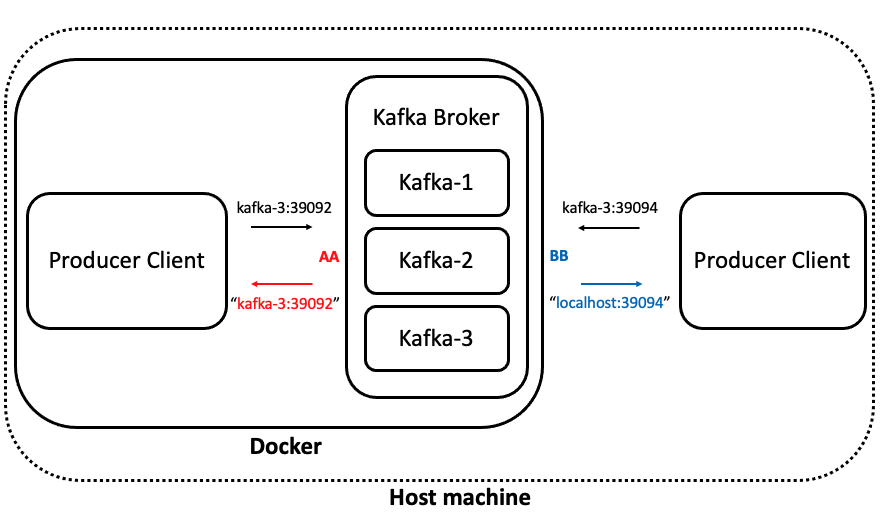 "KAFKA_ADVERTISED_LISTENERS" 값은 위에서 구분한 listener에 맞게 다시 Client에게 반환시킬 서버 주소입니다. Client는 이 서버 주소를 받아 직접 Topic을 produce / consume 합니다. 예시에서는 AA를 Docker 내부 통신을 의도했기 때문에 Client에게 hostname을 포함한 주소를 반환해줘도 Client는 해당 hostname을 사전에 알고 있습니다. 하지만 BB는 Docker 외부, 즉 Host machine과 통신을 의도했기 때문에, hostname 대신 localhost를 적었습니다. Host machine은 Docker container와 통신하려면 port forwarding 된 localhost를 사용해야 하기 때문입니다.