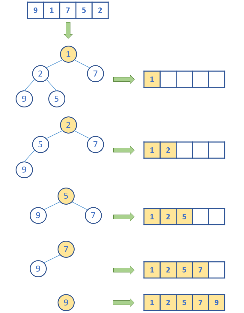 { 9, 1, 7, 5, 2} 순서대로 원소가 존재한다고 가정했을 때 힙 정렬의 예시는 다음과 같습니다. {9, 1, 7, 5, 2}의 원소들을 순서대로 힙에 삽입하는 작업을 진행하고 삽입 결과 힙의 구조는 아래와 같습니다. 힙이 만들어졌다면 루트의 값을 배열에 순차적으로 넣는 작업을 n번 진행합니다.