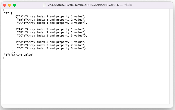 Json의 가장 최상위에 A, B라는 key 값들이 존재합니다. A는 Array 타입으로써 index 당 AA, BB, CC라는 key값들로 String 타입의 Value들을 가집니다. 그리고 A는 동적인 크기를 가지기 때문에 위의 그림에서는 index가 3까지밖에 없지만, 데이터에 따라 10개, 100개도 존재할 수 있습니다. B는 단순히 String 타입의 Value를 가집니다. 아래는 위에서 제시한 구조의 Json 데이터 예시입니다.