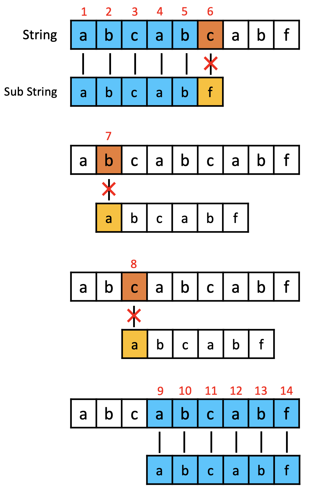 우선 단순 비교로 문제를 푸는 방법을 소개하겠습니다. 전체 문자열의 시작 문자부터 Sub 문자열의 문자를 하나씩 비교합니다. 이렇게 Sub 문자열의 전체가 일치할 때까지 진행합니다. 단순 비교의 시간 복잡도는 전체 문자열의 크기 \( N \) 만큼 for 문을 사용하고 Sub 문자열의 크기 \( M \) 만큼 for문을 사용하기 때문에 \( O(NM) \) 가 됩니다. 이 때 \( M \) 의 크기가 \( N \)이 된다면 \( O(N^2) \) 까지도 증가하게 됩니다. 아래 예시에서는 총 14번의 문자 비교가 필요합니다.