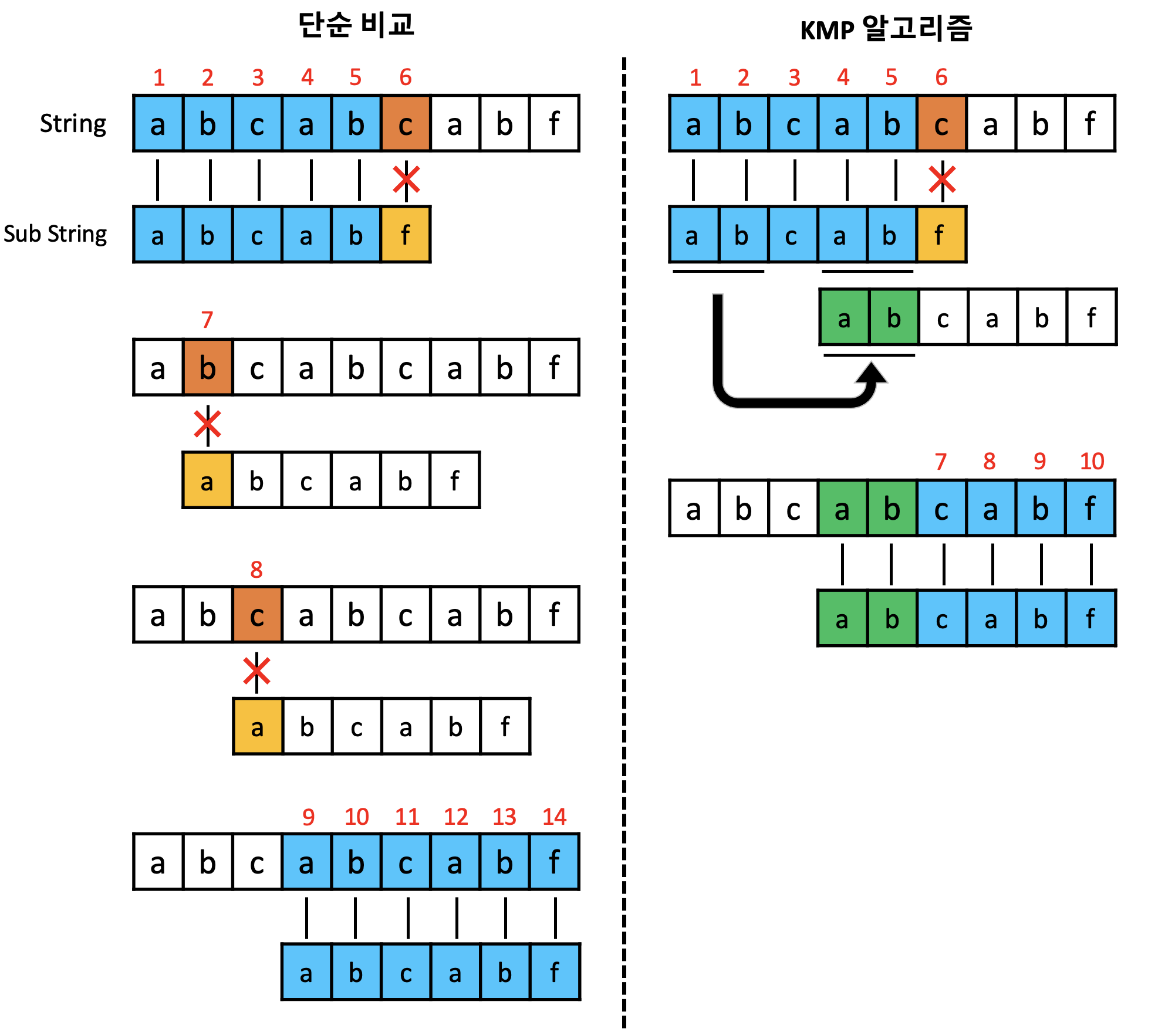 KMP 알고리즘의 핵심은 지금까지 연속으로 일치한 문자열에서 접두사와 접미사가 같은 경우가 있을 때 중간 과정을 생략하고 접미사를 접두사의 위치로 점프시키는 것입니다. 접두사와 접미사를 사용하는 이유는 위에서 말한 중복 상황을 고려하기 위함입니다. 글로는 이해가 어려울 수 있습니다. 아래 그림에서 단순 비교 방법과 비교하여 원리를 알면 더 이해하기 쉬울 것입니다.