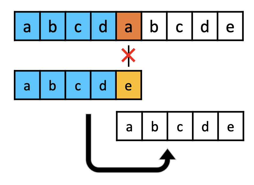 우리는 위의 경우처럼 전체 문자열 N개를 하나하나 비교하고 싶지 않습니다. 효율적으로 비교가 필요 없는 부분은 아래처럼 생략하며 진행하고 싶습니다. 하지만 아래처럼 sub 문자열을 다시 처음부터 비교시키기엔 예외 상황이 있습니다. 바로 지금까지 비교해서 일치한 문자열 중 중복되는 문자열이 존재하는 경우입니다. 이러한 예외 상황을 고려해 효율적으로 중간 과정을 생략한 알고리즘이 바로 KMP 알고리즘입니다.