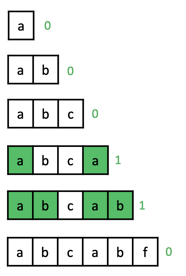 위의 KMP 알고리즘을 적용하기 위해 Sub 문자열의 각 문자열 위치에서 접두사, 접미사가 일치하는 최대 길이를 사전에 계산합니다. 이 때 이 값을 "Longest Proper Prefix which is Suffix"라고 하여 LPS 배열이라고 부릅니다. 하지만 LPS 배열을 계산할 때 주의할 점은 Sub 문자열 또한 결국에는 문자열의 비교 과정이기 때문에 위에서 소개한 원리가 그대로 적용이 됩니다. LPS 배열의 이전 index 값들을 이용하여 LPS 배열의 새로운 index 값을 구합니다.