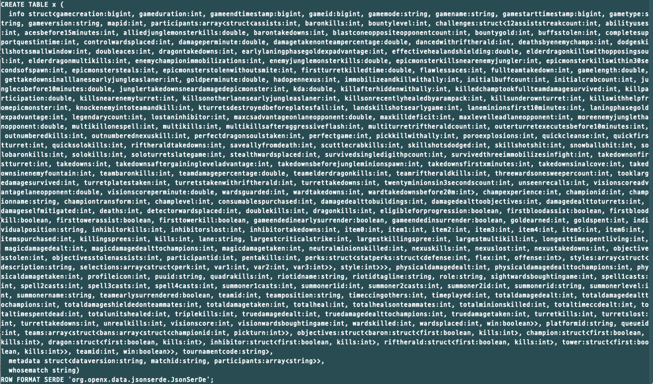 위의 결과처럼 create table 쿼리문을 자동 생성하여 출력해줍니다. 위의 예시는 간단한 Json 스키마를 사용했지만, 제가 작업했던 게임 데이터를 저장한 Json 파일의 경우 상당히 complex 스키마임에도 불구하고 아래처럼 상당히 긴 쿼리를 만들어줍니다.