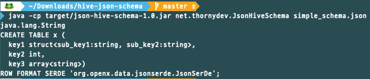 $ java -cp target/json-hive-schema-1.0.jar net.thornydev.JsonHiveSchema simple_schema.json