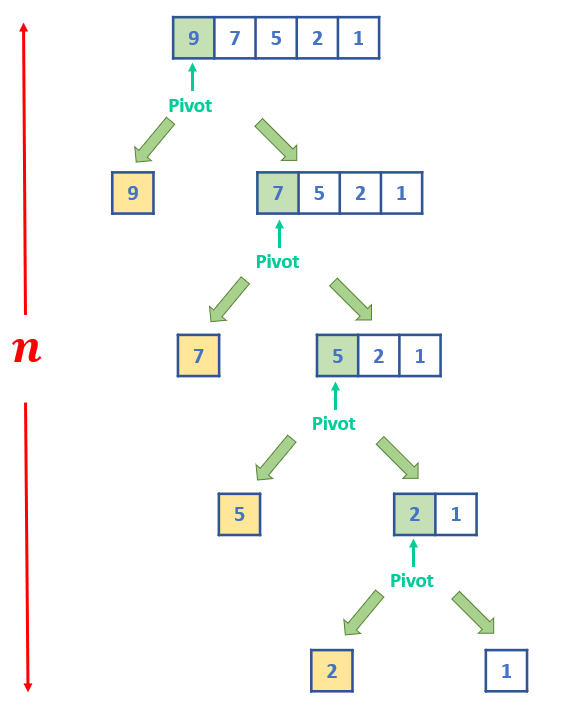 하지만 \( O(n \log n) \)은 퀵 정렬의 평균적인 시간 복잡도입니다. 위에서 말했듯이 최악, 최상의 경우가 다른데 결론부터 말하자면 최악의 경우 \( O(n^2) \)가 되어버립니다. 아래 그림처럼 정렬의 역순으로 배치가 되어있다면, pivot을 기준으로 작은 값이 존재하지 않게 됩니다. 결국 매번 1개의 원소만 줄어들기 때문에 트리의 깊이는 \( n \)입니다. 그래서 마찬가지로 매번 n번의 정렬과정이 필요하기 때문에 시간 복잡도는 \( O(n^2) \)입니다.
