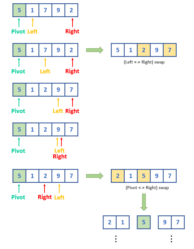 { 5, 1, 7, 9, 2} 순서대로 원소가 존재한다고 가정했을 때 퀵 정렬의 예시는 다음과 같습니다.