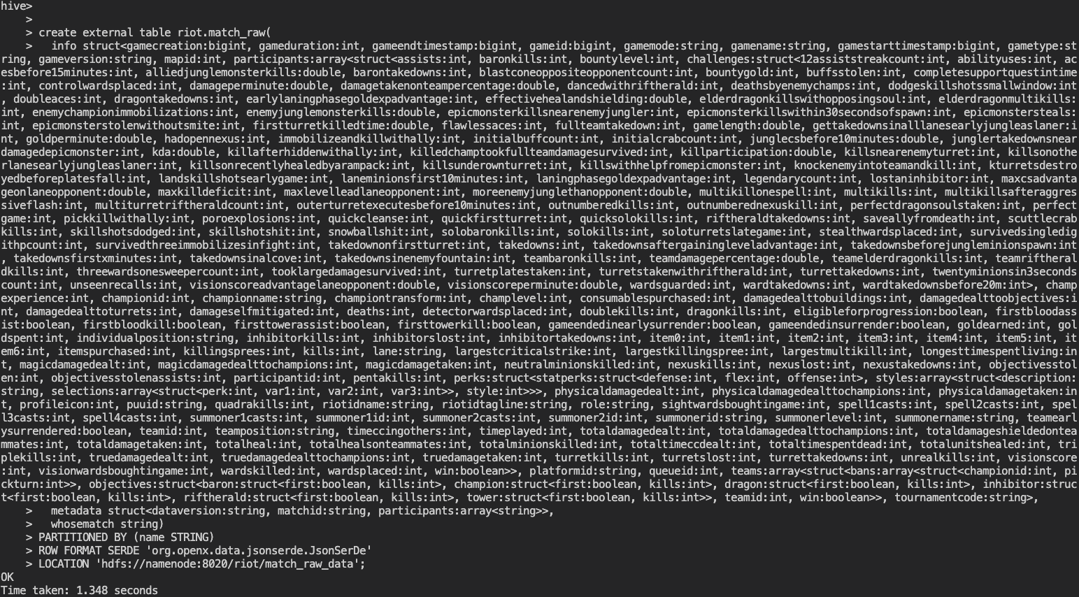 Riot 데이터를 수집해서 최종적으로 HDFS에 저장하는 과정까지 성공했습니다( 비록 미흡한 점이 상당히 많지만.... ). 이제는 저장된 데이터를 기반으로 Hive 테이블을 생성하는 과정을 진행하겠습니다.