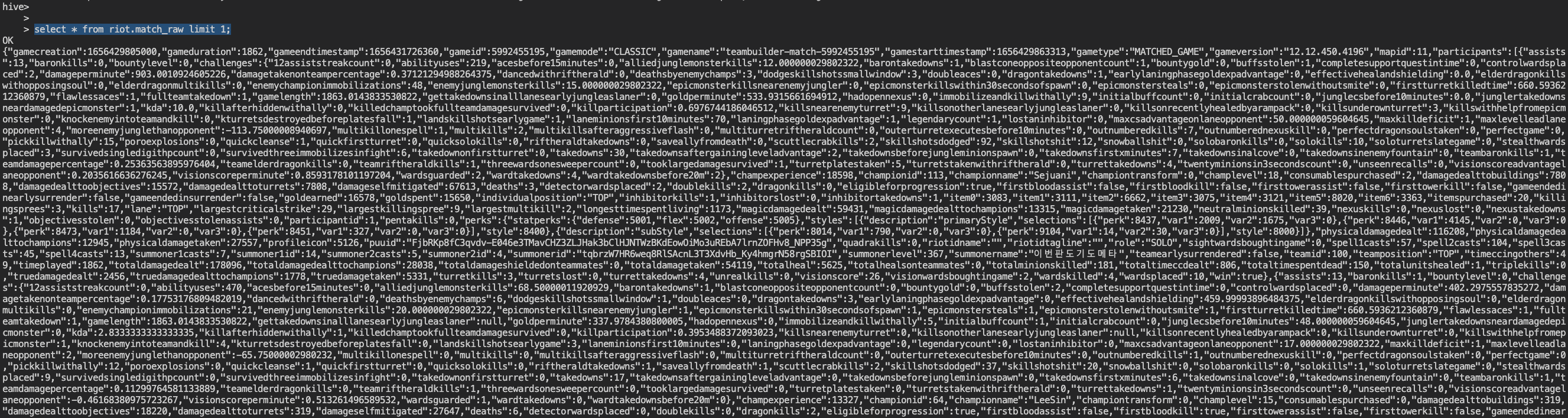 데이터는 모두 준비되었으니 이제 테이블을 생성하겠습니다. Hive 테이블 생성 시 Json 파일을 기반으로 한다면 JsonSerDe 형식으로 지정할 수 있습니다. 하지만 문제는 따로 있습니다. Riot Match 데이터의 경우 모든 키 값의 갯수가 약 300개 이상입니다. 테이블 생성 쿼리를 사용할 때 Json 구조에 맞는 column 명시가 필수적입니다. 300개 이상의 column 값들을 모두 적는 것은 상당히 어렵고 시간 낭비라고 생각합니다.